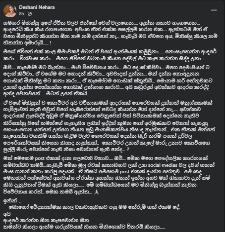 ඒත් ඇය ඒ සම්බන්ධතාව ඇතුළේ ජීවත් වෙලා තියෙන්නේ නම් ගොඩක් ලොකු කලකිරීමකින් වගේම ගැටලු ගොඩක් මැද්දේ වගේ. ඔන්න මේ කාරණය ගැන ඇය මේ වගේ සටහනක් මුහුණුපොතට එක්කරලා තිබුණා.